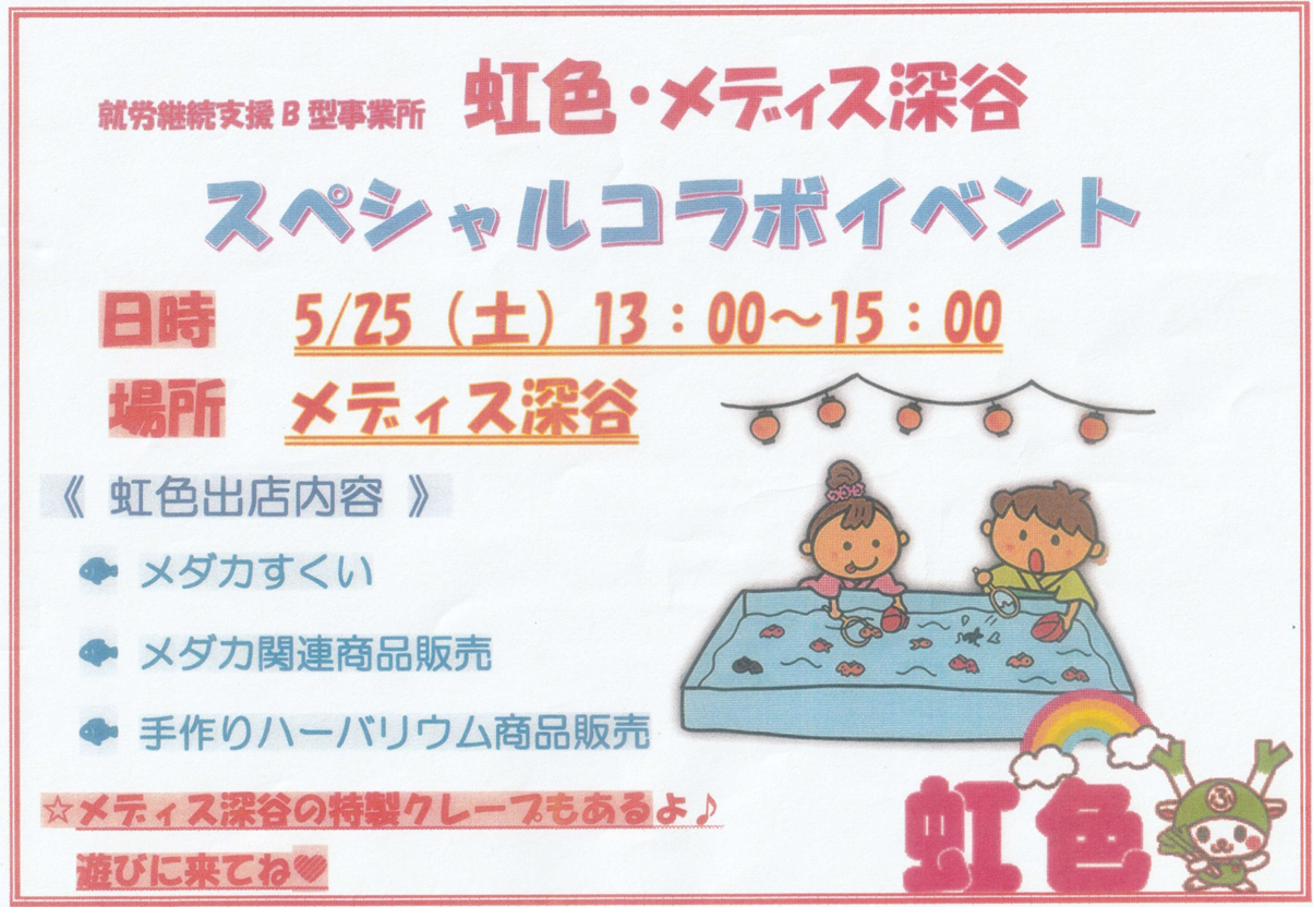 ”メディス藤岡・メディス深谷のスペシャルイベント”ですが、就労継続支援B型事業所・虹色様ともコラボして頂けることになりました! 虹色様よりメダカすくいやメダカ関連商品販売など企画いただいております。