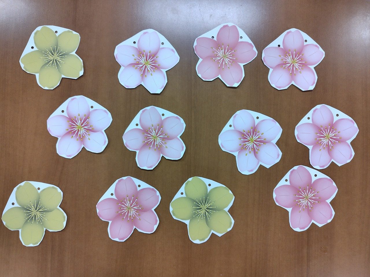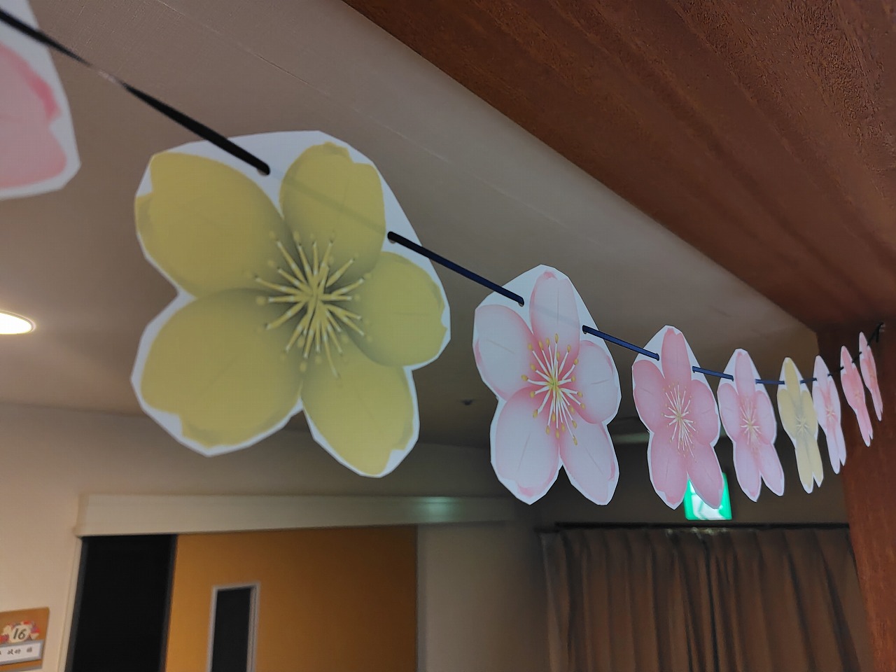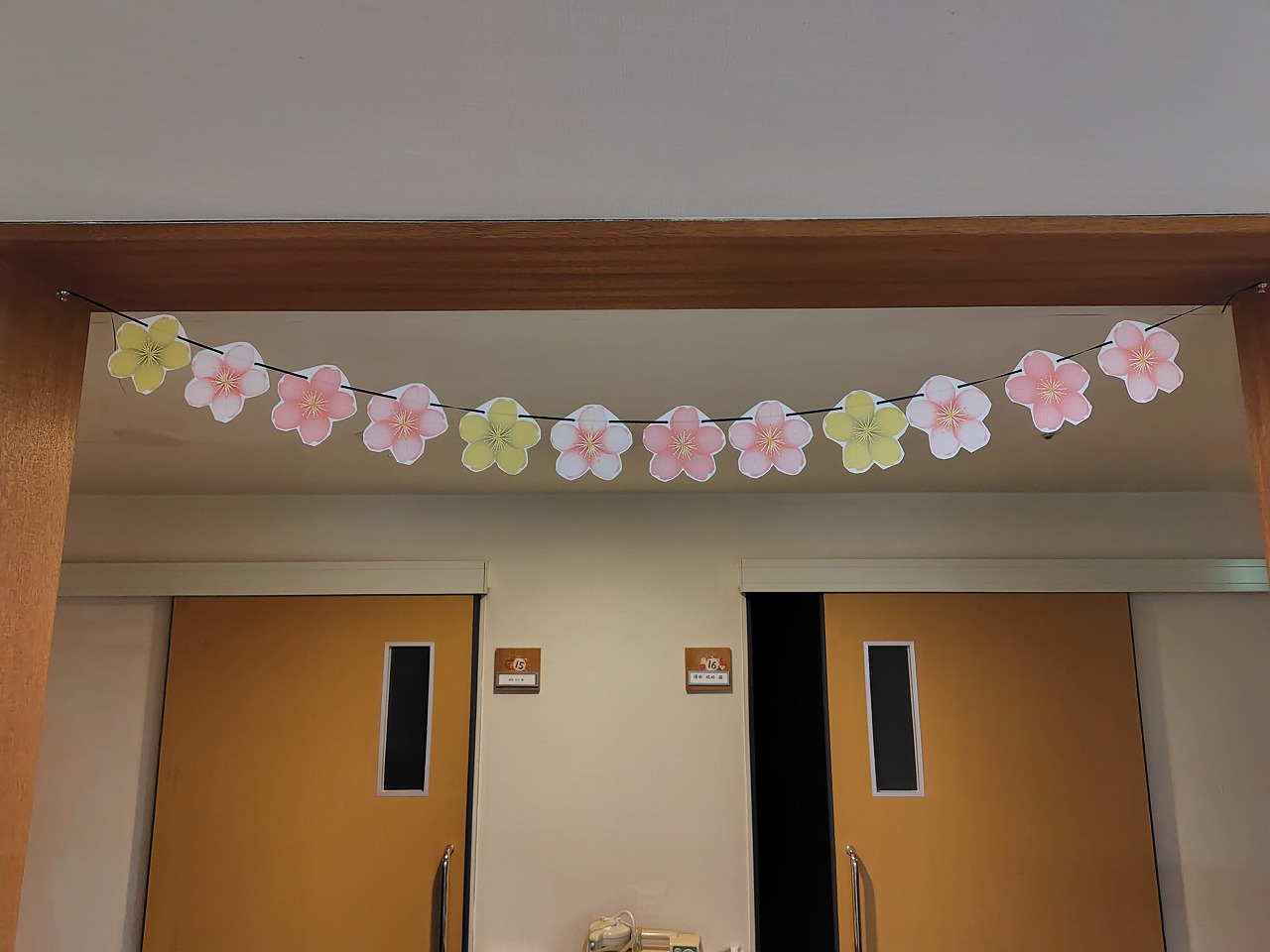 昨日スタッフが切り抜いていたさくらがガーランドになっていることを確認しました!