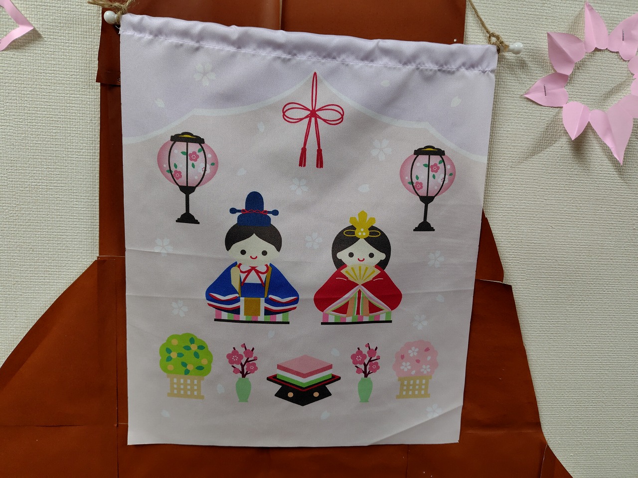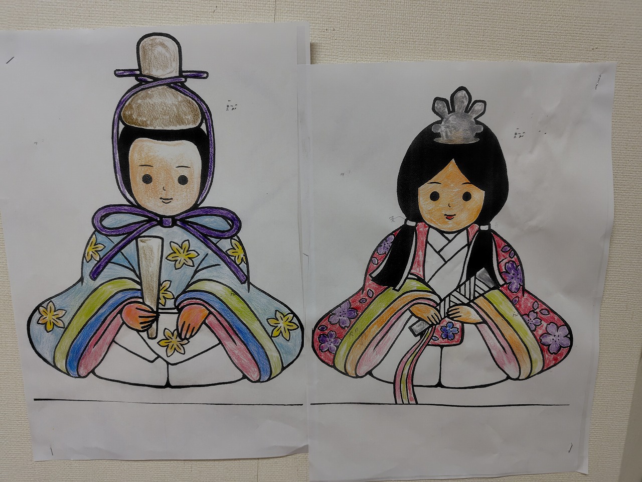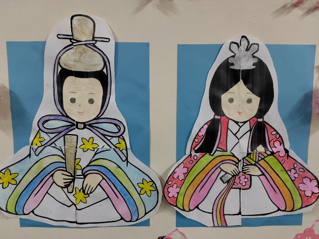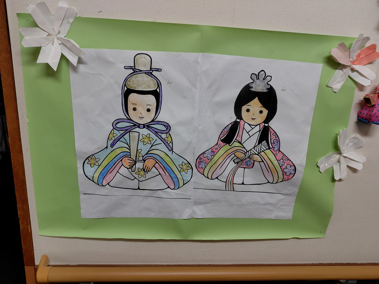 施設では入居者様に塗り絵で作成していただいたお内裏様とお雛様を始めとして、ひな祭り関連のアイテムを壁に飾ってみました。