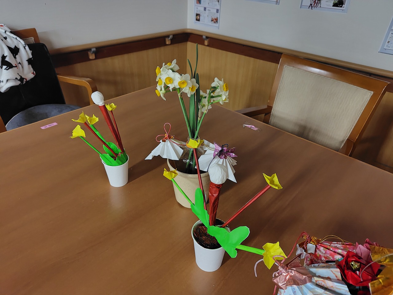 テーブルに華やかさを出すために入居者様が折り紙で花を作ってくれました。