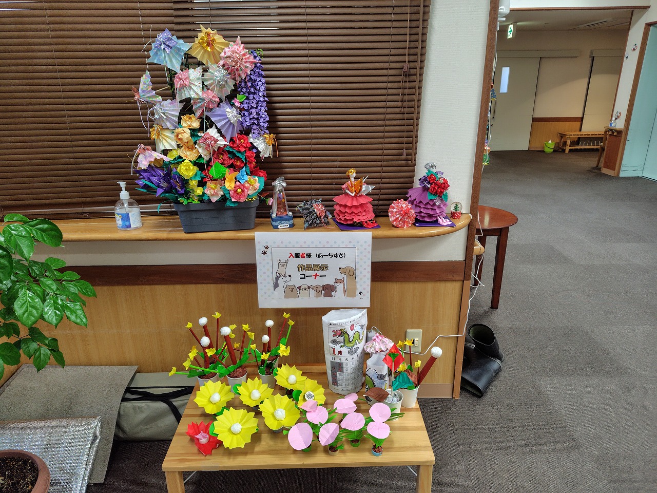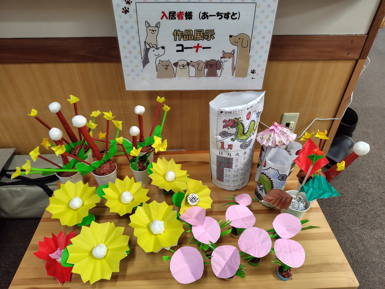 最近、入居者様が色々と作品を作ってくれるので、入居者様作品展示コーナーを設けました。