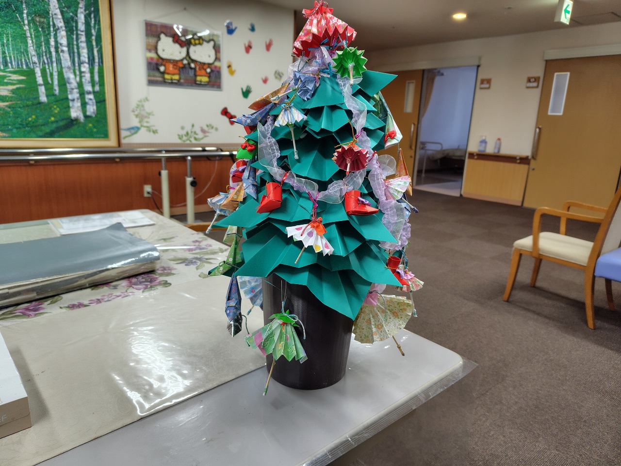 以前、入居者様がクリスマスツリーを作ってくれたと紹介しましたが、今回は前回のものと比べて約3倍の大きさとなる大きなクリスマスツリーを作ってくれました。