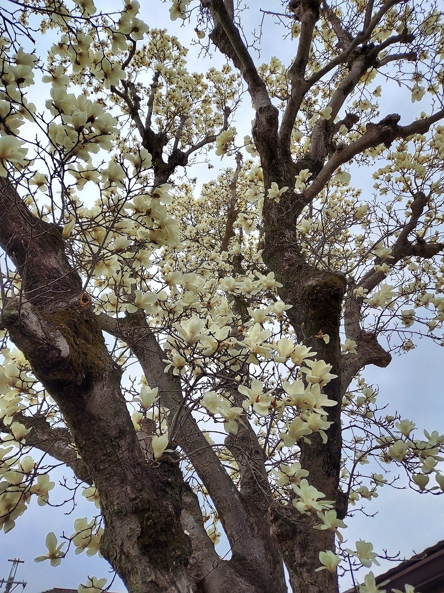 ハクモクレンは、桜の花が咲く直前に見頃を迎えるのでみなさんの近くにも咲いているところがあると思います。