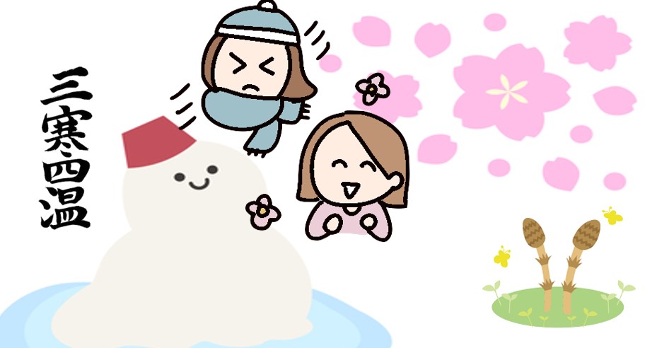 このため、日本においての三寒四温は、本来使われる冬ではなく、寒暖の変化がはっきりと現れる2月の終わり頃から3月初めの春先に用いられるようになったとのこと。