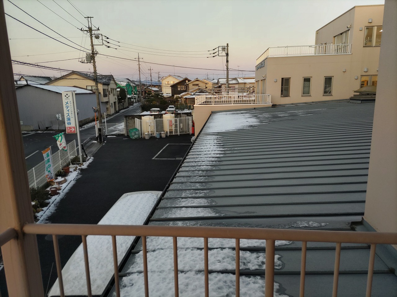 もう一枚の施設屋根の写真は、今朝6:00頃のようすです。朝までに路面も含め屋根の雪は大半が解けていました!
