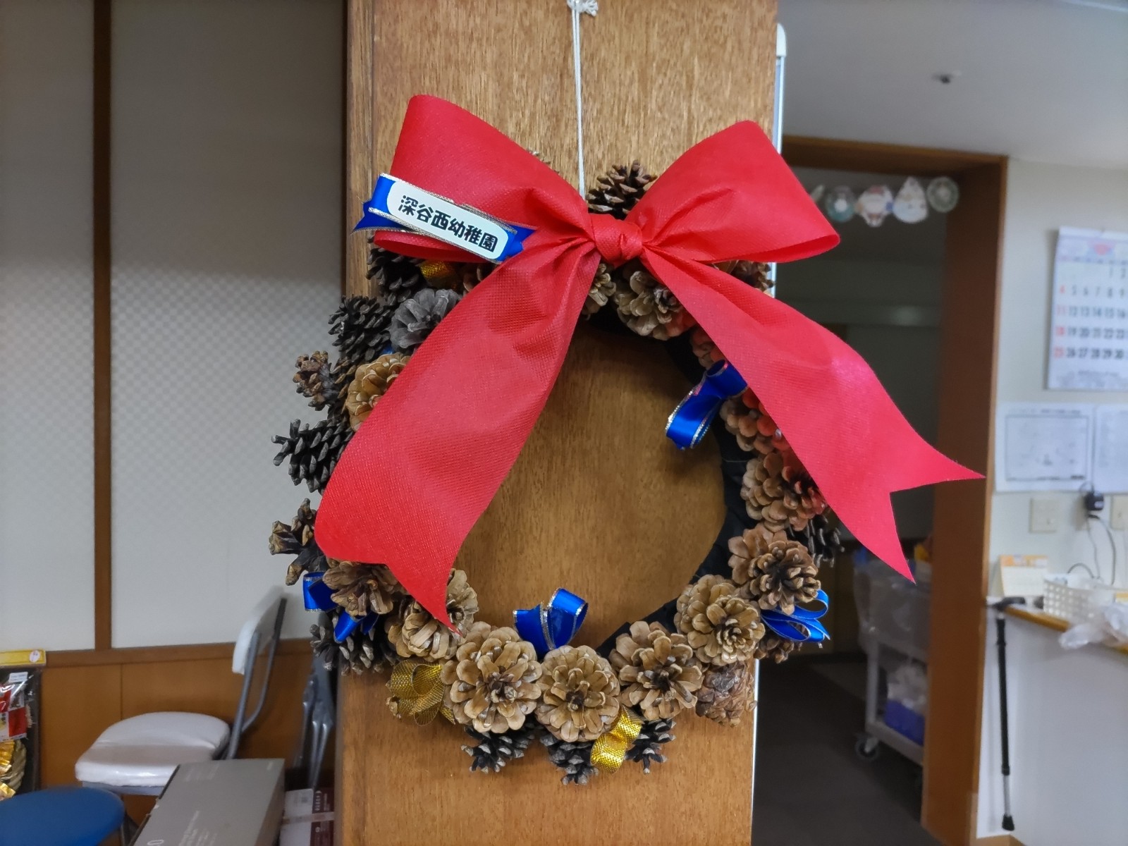 一つは、西幼稚園で取れた松ぼっくりで作ったクリスマスリーフです。