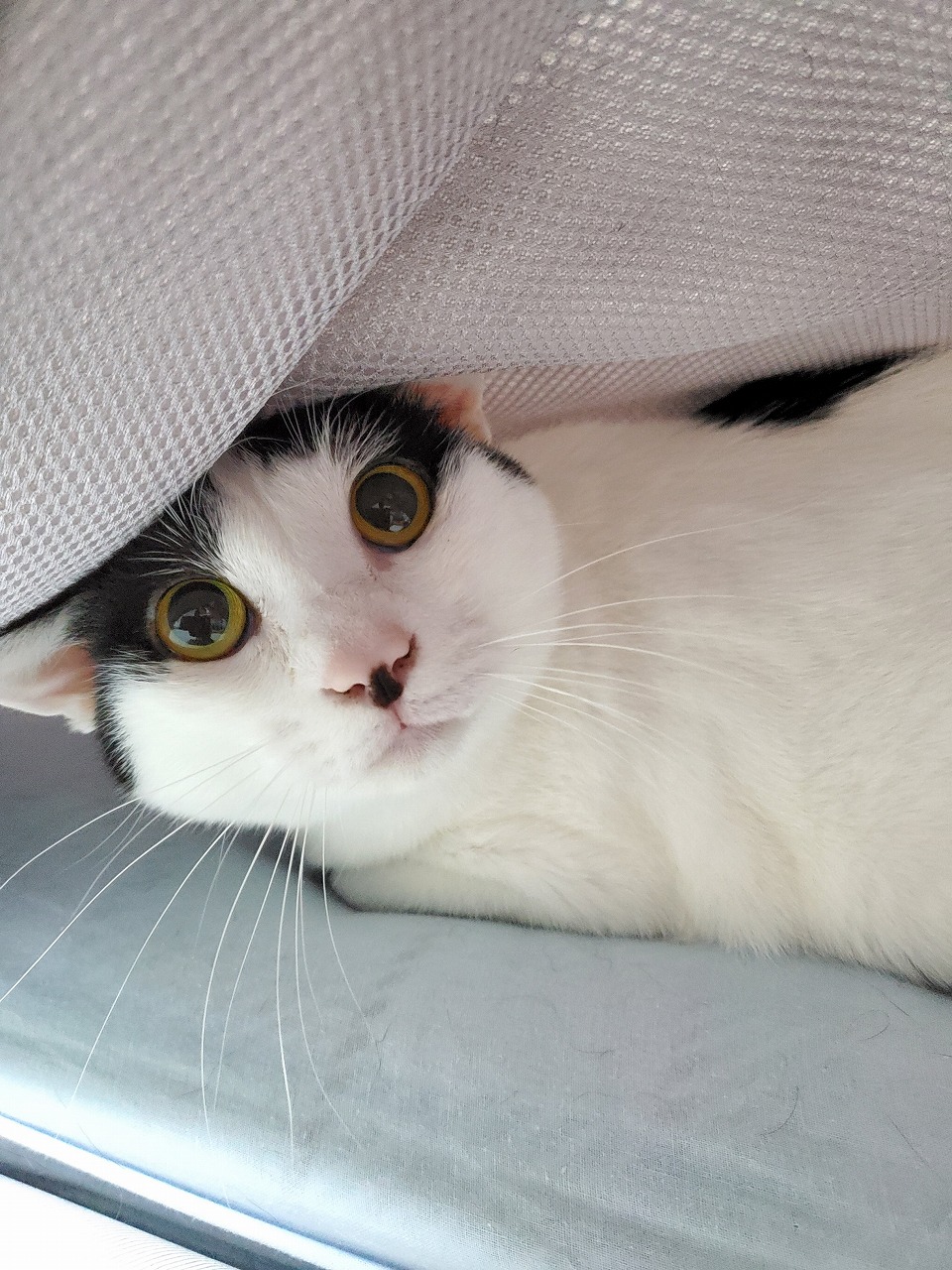 今月のペット紹介は、お布団の中にいるネコちゃんです。