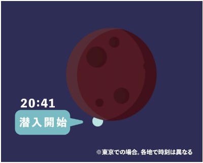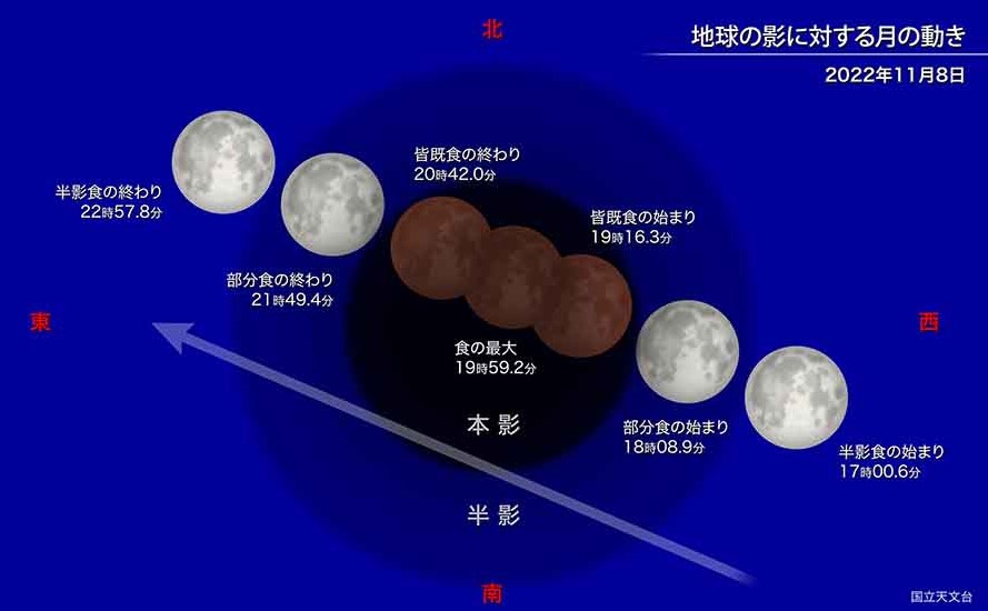 月は18時9分に欠け始め、19時16分に皆既食となる。皆既食は20時42分まで続き、21時49分に月食が終わる