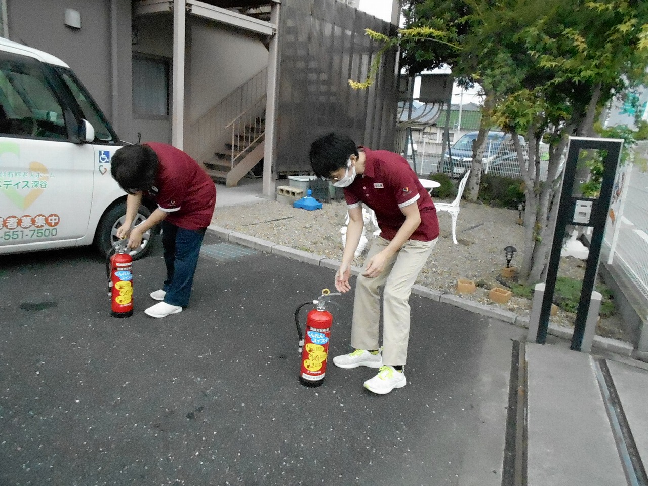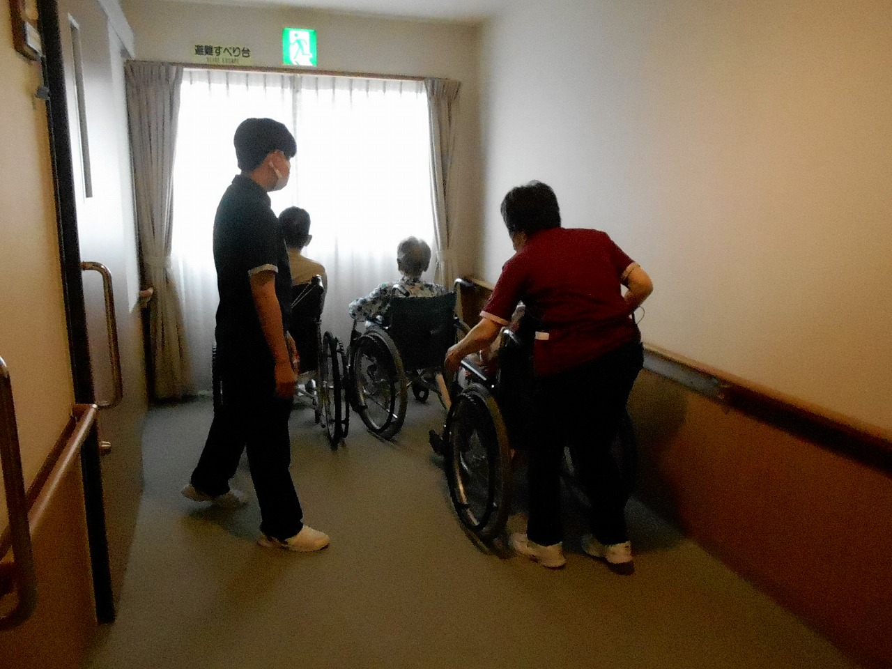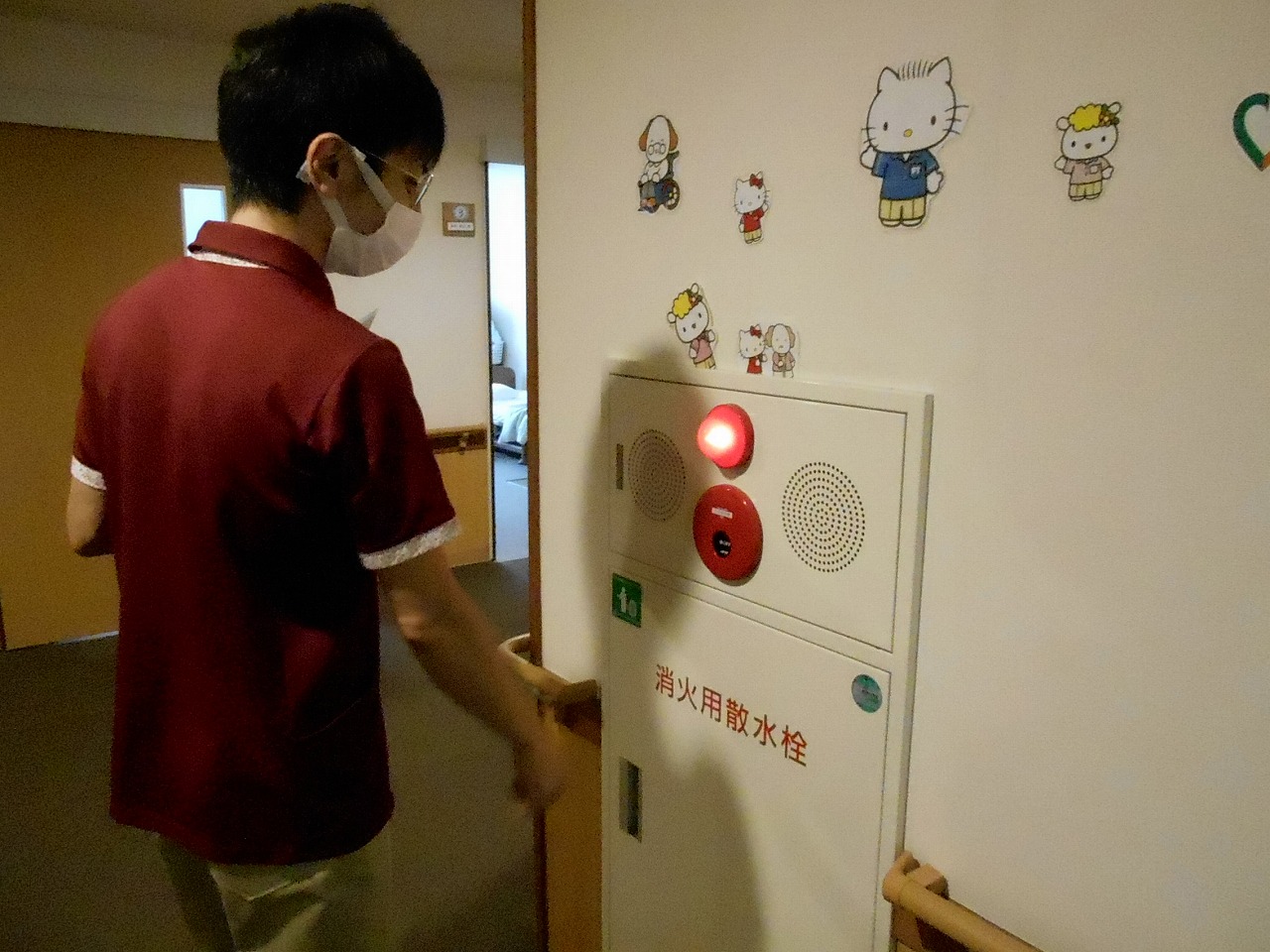 まず、非常ボタンの動作を確認、その後各居室から避難経路を確保したら非常口まで誘導です。
