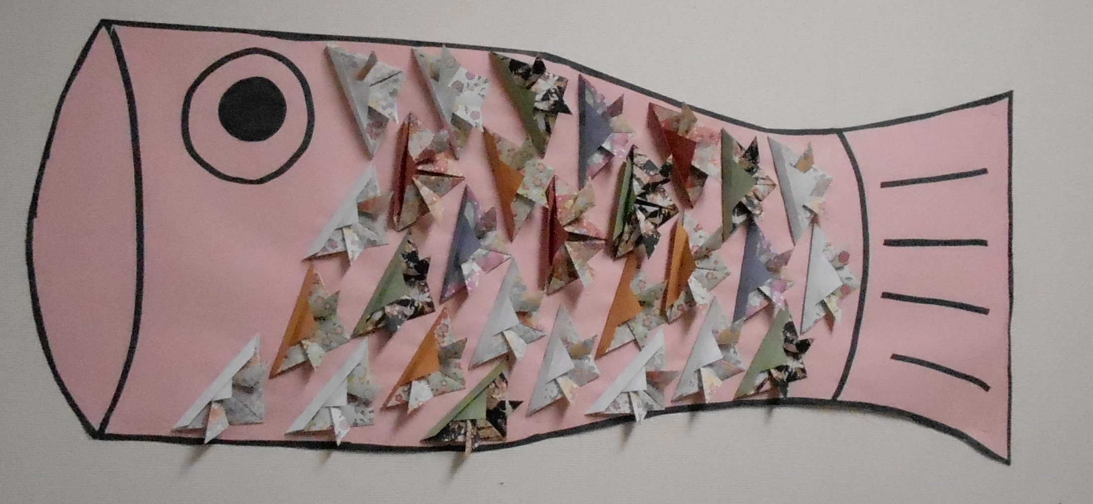 魚のウロコを兜に折った折り紙を貼り付けるこだわりを入れて見ました。