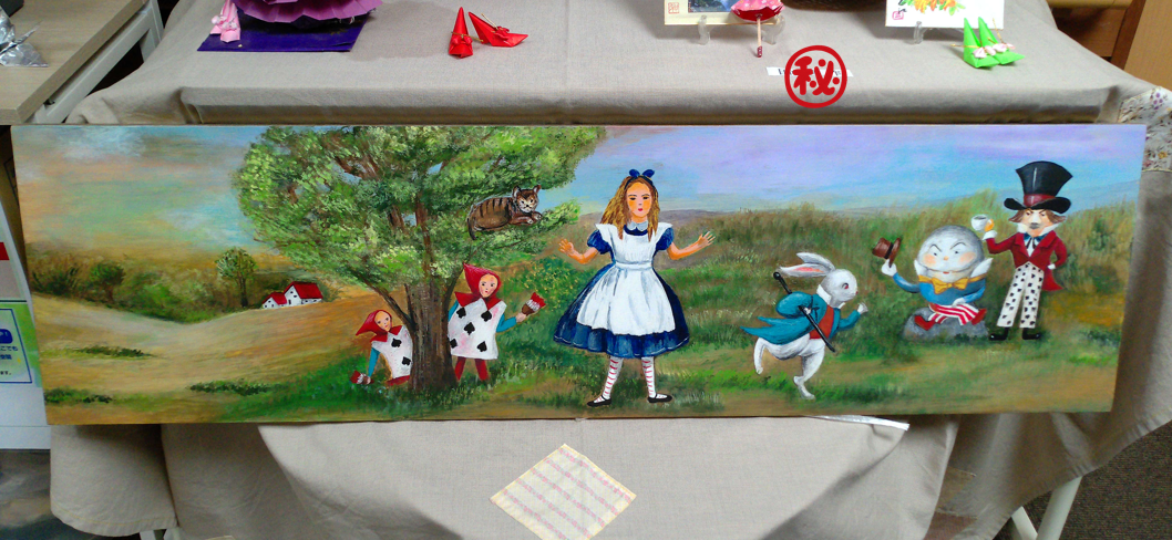 作品としては、生け花、クラフトアート、編み物タペストリー、スクラッチアート、絵などが飾られました。