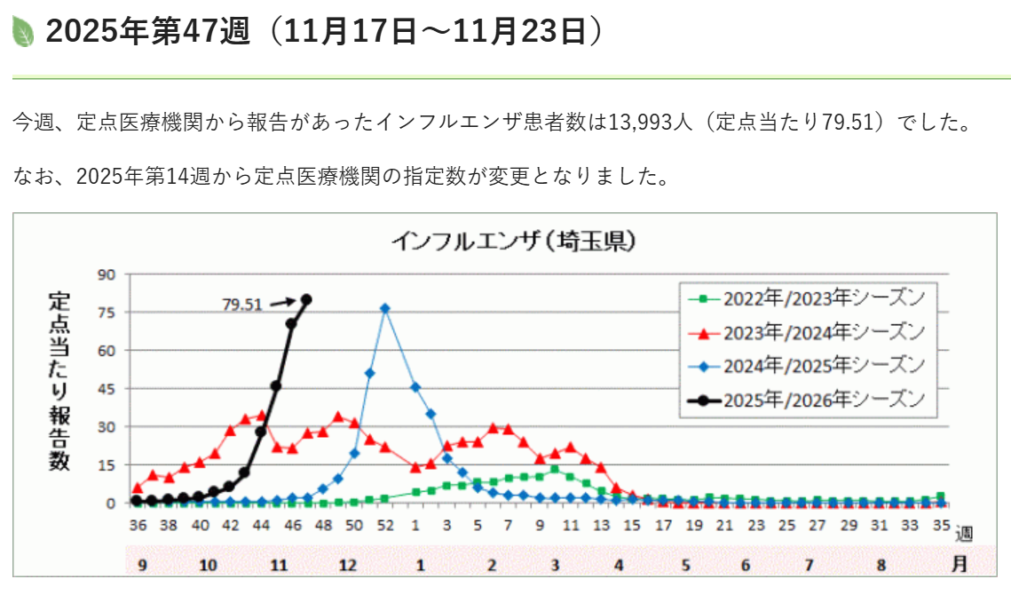 先週時点の情報ですが、定点医療機関から報告があった埼玉県のインフルエンザ患者数は13,993人(定点当たり79.51)だったとのことです。