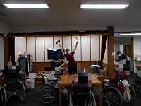 「赤揚げて」。「白挙げて」。司会者の合図に合わせて、入居者様に赤いリボン、あるいは白いリボンを付けたキティちゃんを揚げて頂きました。