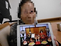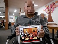 「うれしいひなまつり」の歌を皆様と一緒に歌い、雛あられをお出しする…までは例年通りですが、今年は、iPadを駆使して「リモート雛飾り観賞会」を実施しました。
