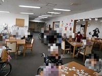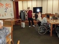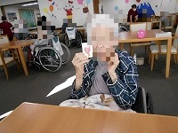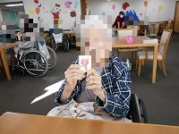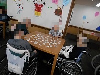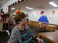 いつぞの誕生日会で使用した「本日の主役」用帽子を被って頂くなど、ユーモアも交えながら和気藹々と、カルタ取りを競ってもらいました。