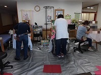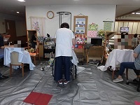 これを受けて、外部からのサービス提供も一部解禁となっています。写真は、訪問理美容の様子です。久しぶりの散髪の機会となり、入居者の皆様もさっぱりとした表情を浮かべられていました。
