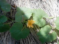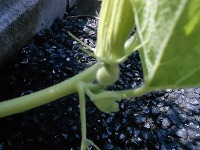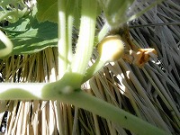 若い実が砂利で傷つき腐らないよう、下に藁を敷いてみました。今度こそ大きく育てたいところです。