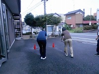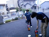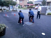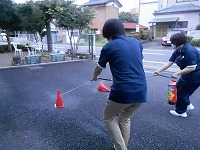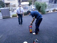 消防訓練の後、消火器の使い方について職員が指導を受けました。