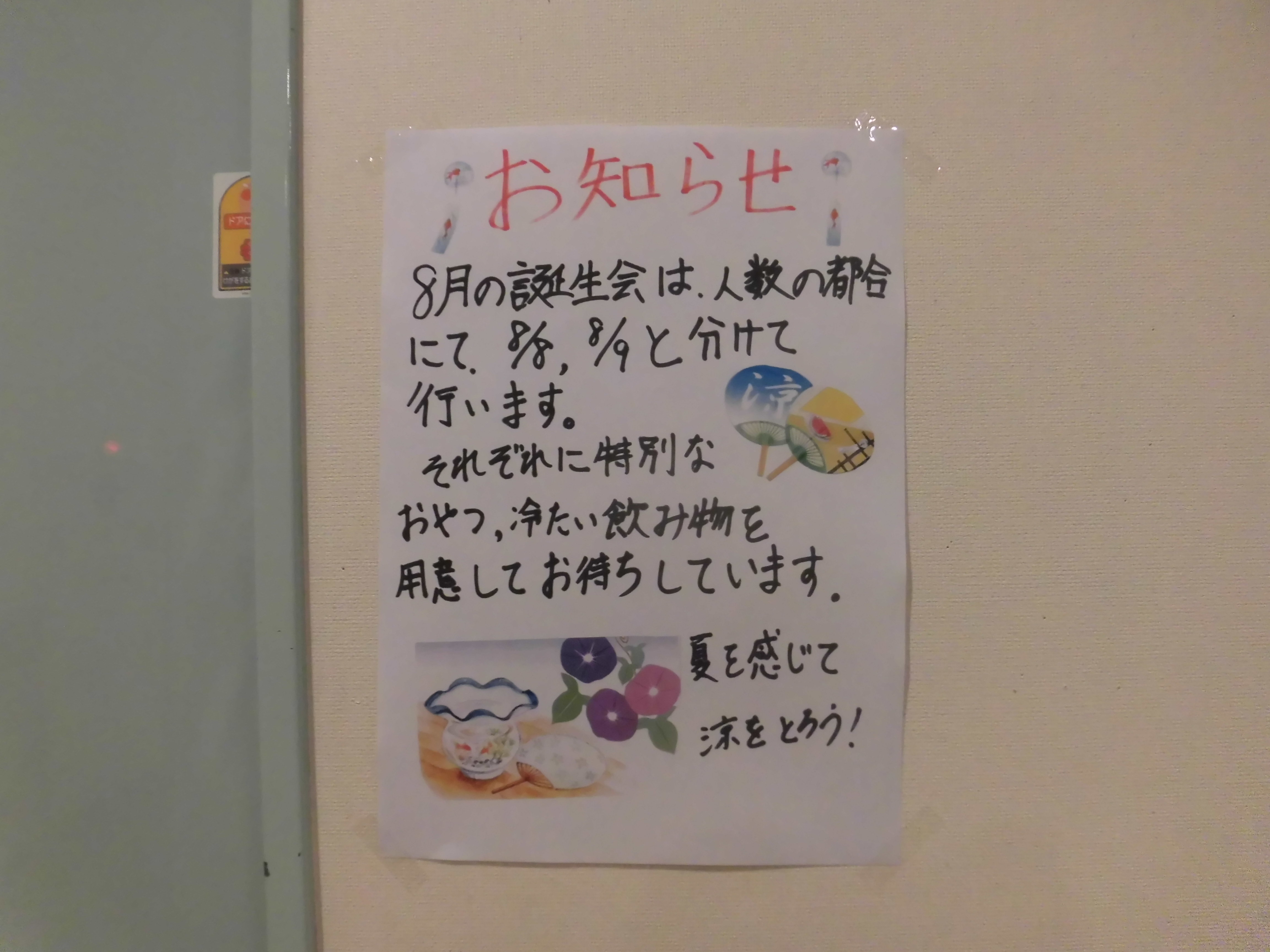 8月の誕生会ですが、人数の都合により、8日(金)と9日(土)に分けて開催します。