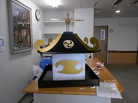 中庭で組み立てていたメディス深谷製お神輿ですが、飾り付け部分を中心に作業を進め、ついにその姿が露わになりました!