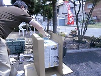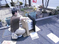 中庭にて、職員2名が何かを作成しています。