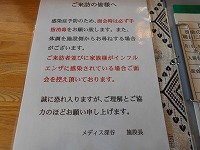 ご来訪者並びに家族様がインフルエンザ等に感染されている場合、ご面会を控えて頂きたく存じます。