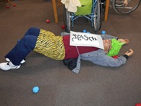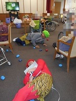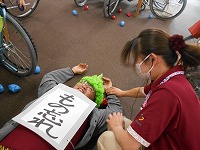 皆で球を投げて「オニは外」「福は内」。オニは降参し、看護師さんに脈を測ってもらいました。