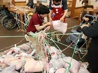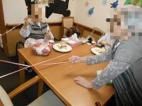 クリスマスプレゼント、サンタさんが配布する物とは別に、入居者の皆様で紐を引っ張って、プレゼントを受け取るという趣向を凝らしてみました。