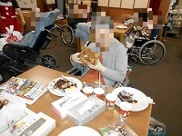 その後、二人場織サンタさんがカップうどんとケーキを食べる技に挑戦。入居者様から自然に笑みがこぼれました。