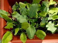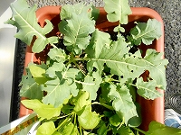 芋虫の食害を受けなかった方のプランターの中は、満員電車の中のように野菜の葉がびっしり生えてきています。