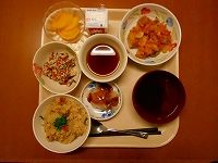 今月は富山県メニューということで、炊き込みご飯、甘えびのかき揚げ、ぜんまいの白和え、里芋の田楽、清汁、が出ました。