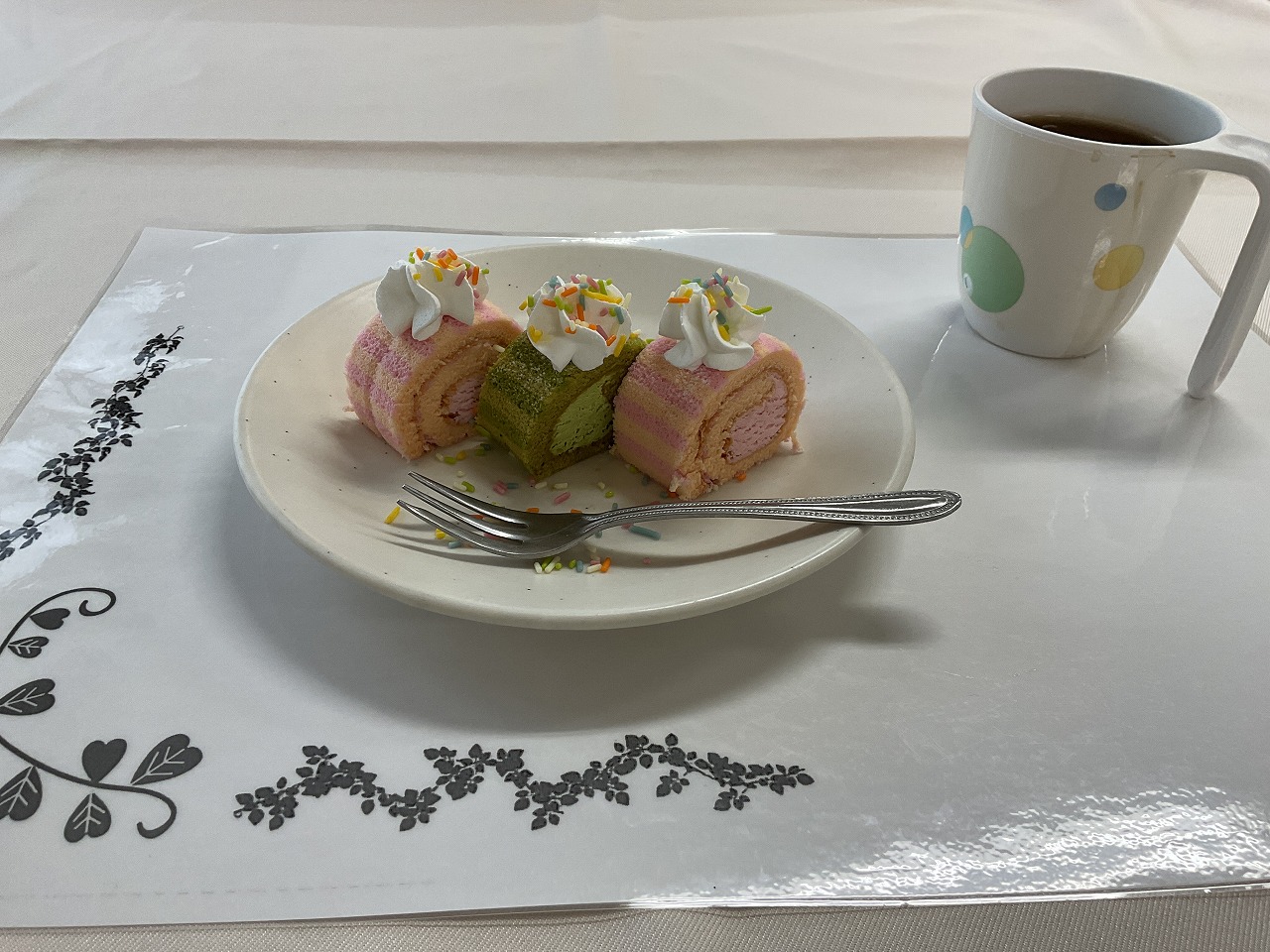 今月のスペシャルおやつは、プチロールケーキ三種盛りです。