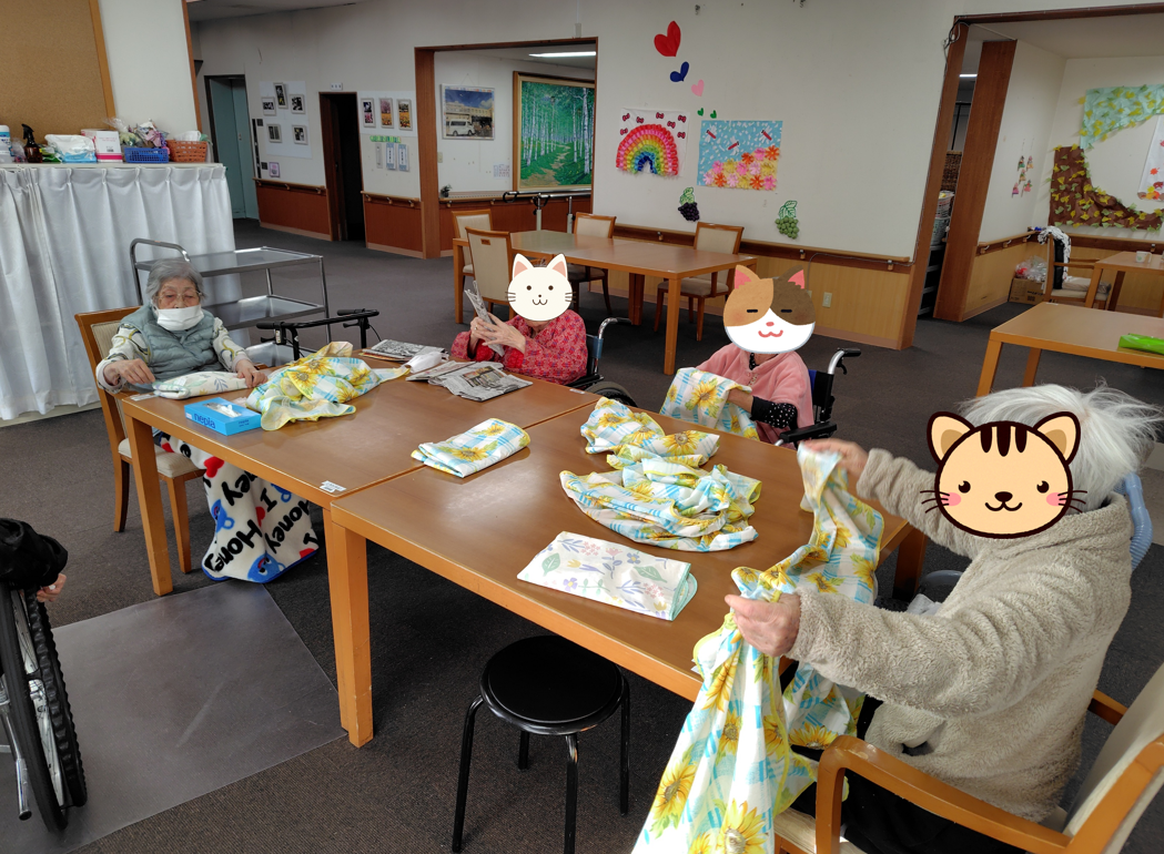 利用者様が使用するエプロンが乾いたので畳んでもらおうとテーブルの上に乾いたエプロンを