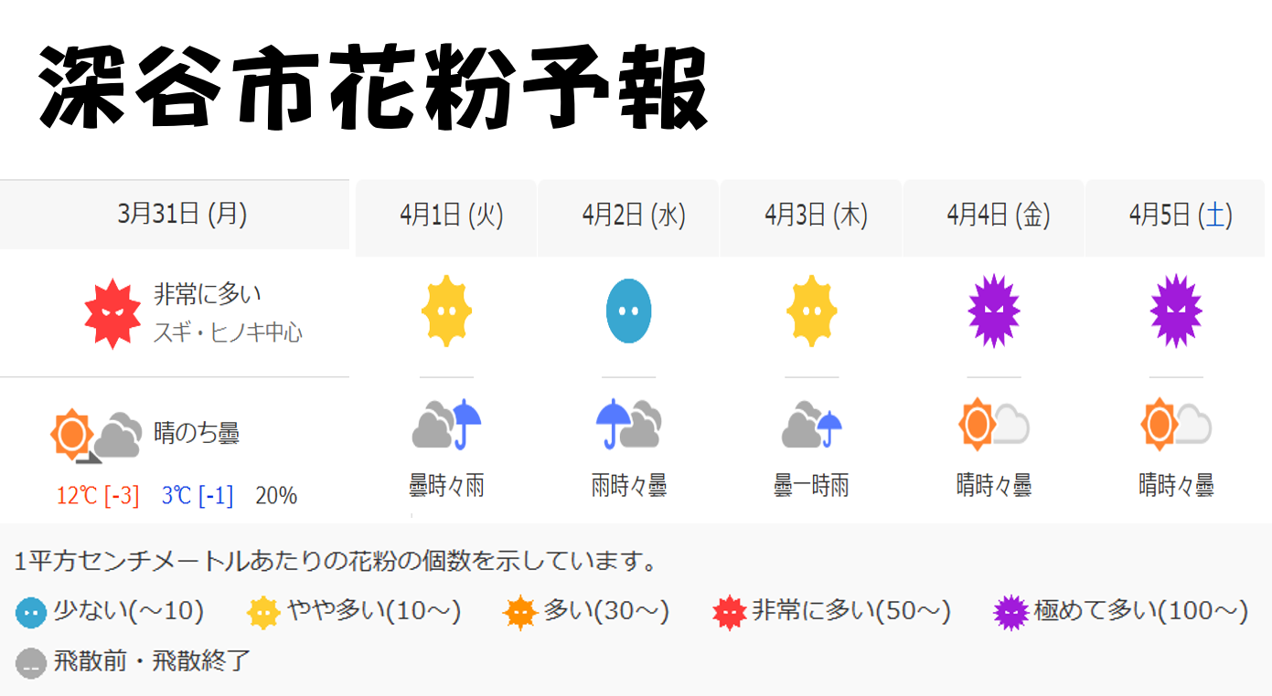 今週の深谷市花粉飛散予報としては、やはり晴れているとそれなりに花粉の飛散は多そうです。雨上がりの翌日は特に多いようなので注意したいですね。