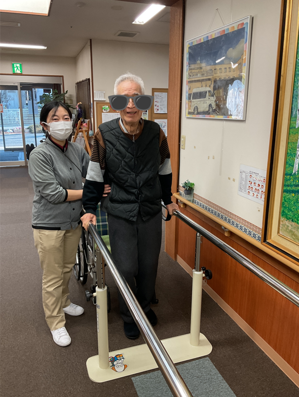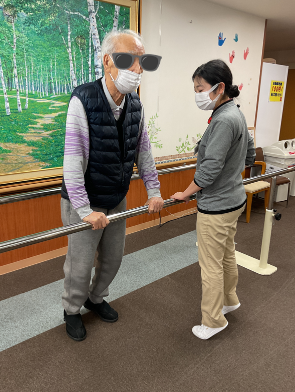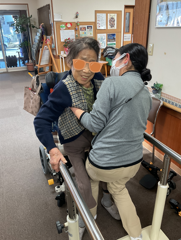 まずは歩行を中心とした個別対応です。入居者様一人ひとりに合わせ、立位・可動域・歩行安定性などをチェックし、ストレッチや歩行訓練をやりました。