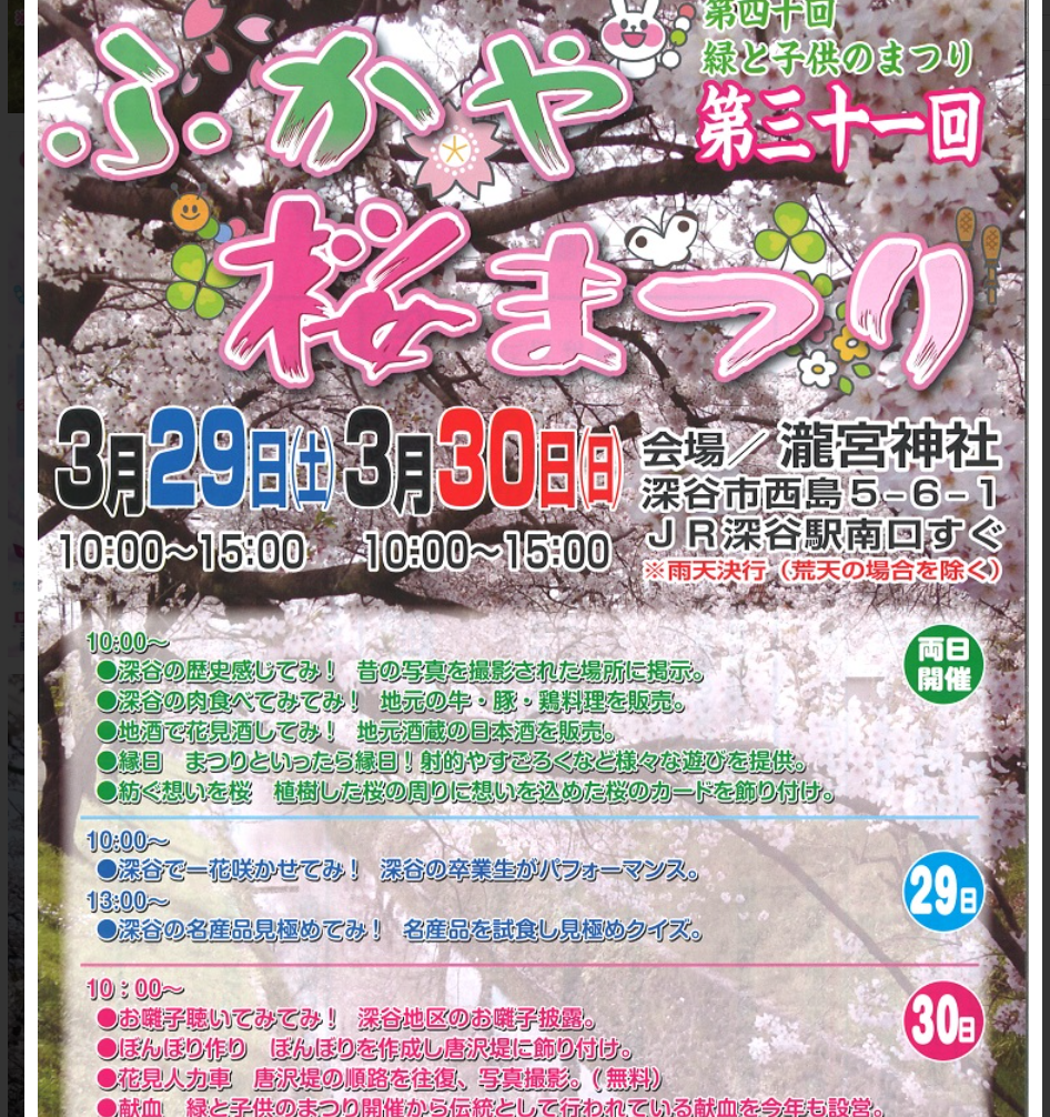 深谷周辺のイベント情報を探していたところ”第31回ふかや桜まつり”が開催されるのを見つけました!