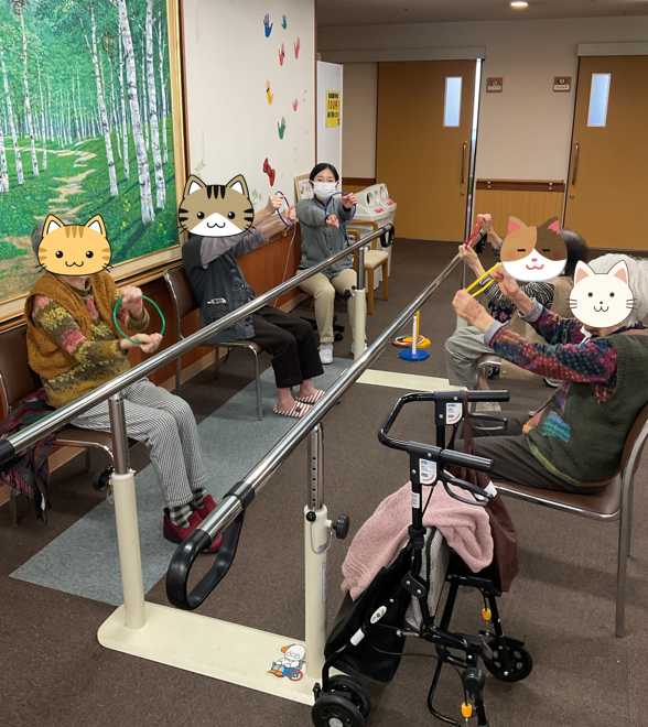あとは、集合リハビリです。今回は輪投げの輪を使って車のハンドルを回すような運動です。運動しながら車の運転歴やドライブの思い出などを話しながら楽しく運動できましたよ!