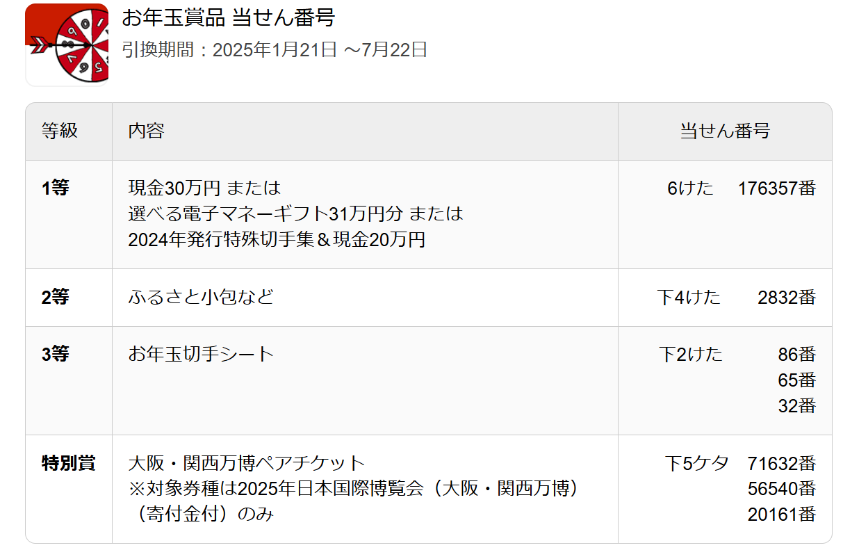 2025年のお年玉付年賀ハガキの当選番号が発表されましたね。