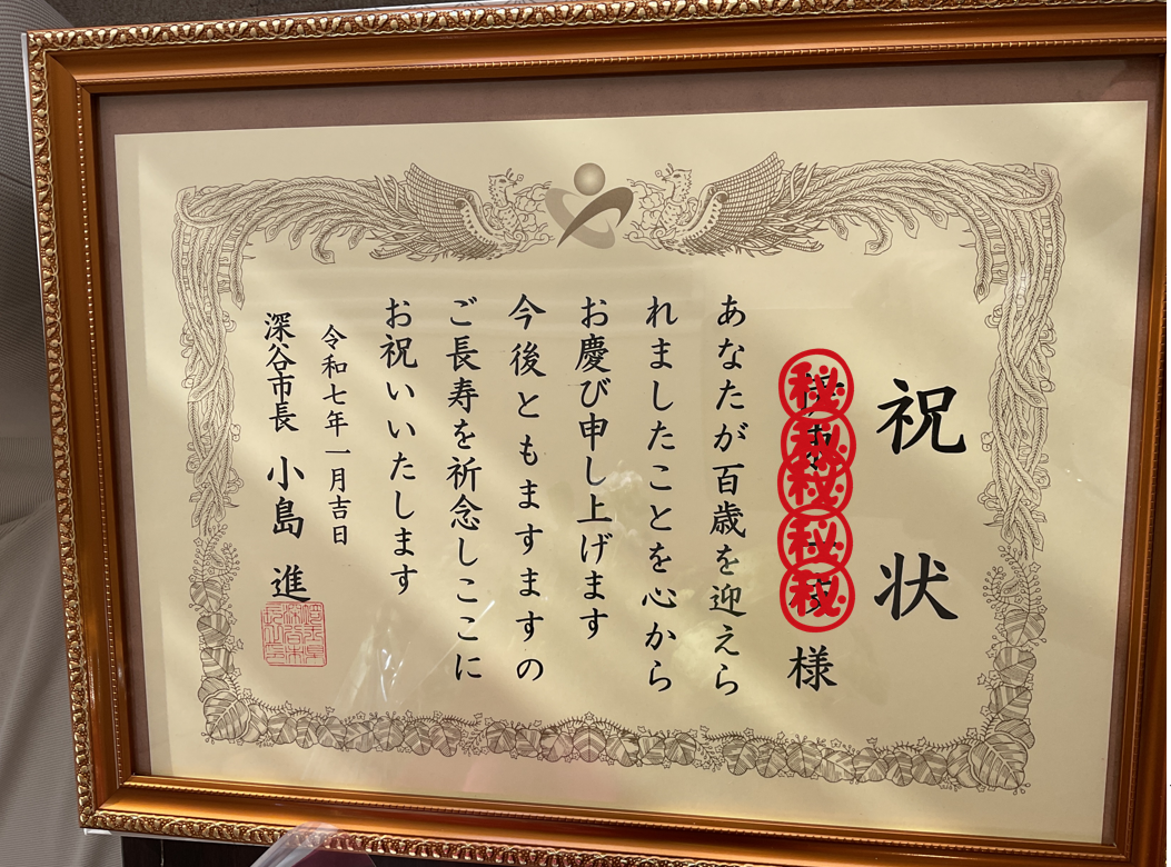 先日、深谷市より賞状とお花を持って直にお祝いに来てくれました。