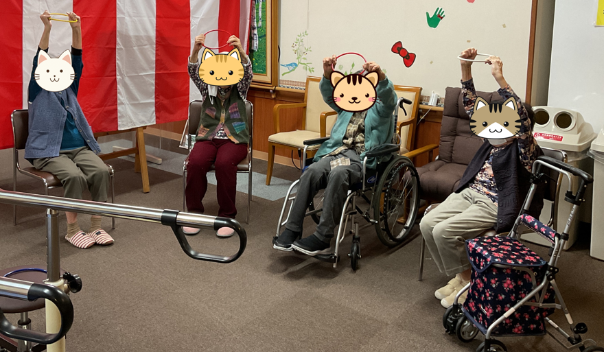 遊びつつも輪投げの輪を持って伸びをするなど可動域を広げる動作も実施しました。