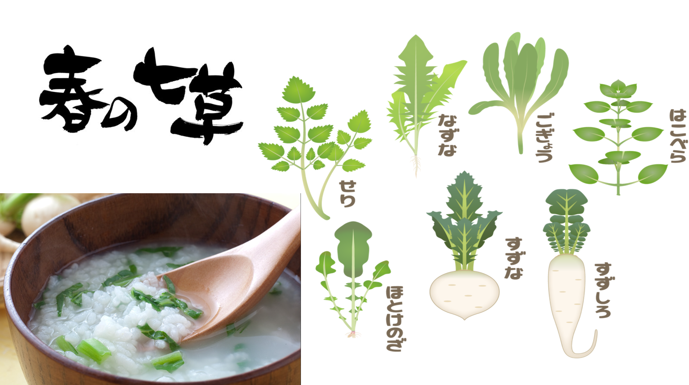 七草は、早春にいち早く芽吹くことから邪気を払うといわれているようです。そこで、無病息災を祈って七草がゆを食べたとのこと。古くはまな板の上で、草をトントン叩いて刻むその回数も決められていたとか??