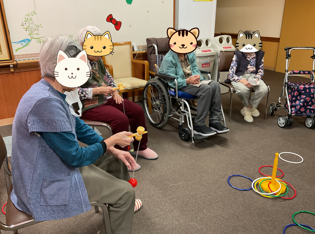 今回は、輪投やけん玉を用いてみんなでワイワイ楽しみながらやりましたよ!