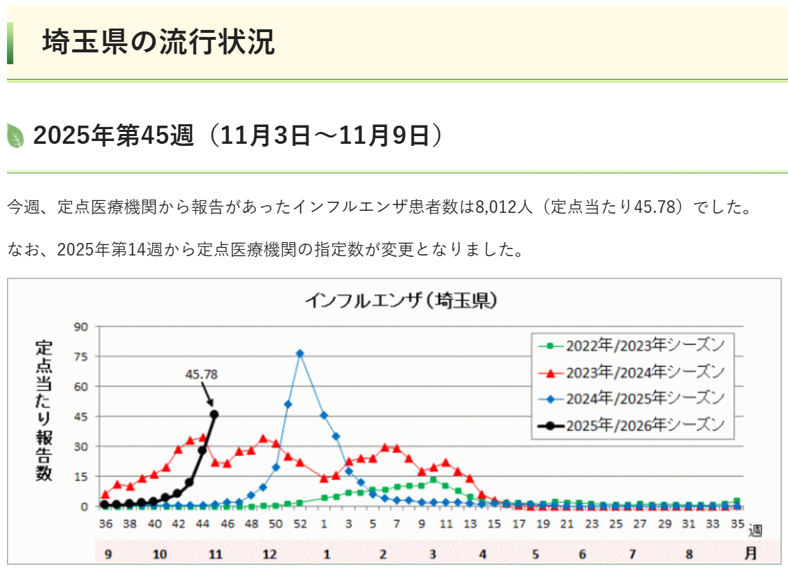 埼玉県内医療機関(定点)からのインフルエンザの報告数が、本年第45週(令和7年11月3日から11月9日)に、1定点当たり45.78人となり、国の定める警報の基準値である30人を超えたとのことです!