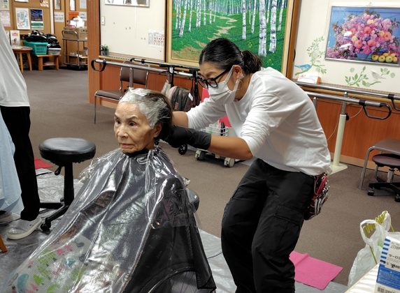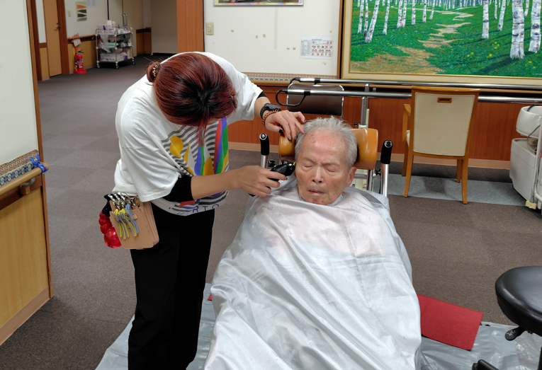 プロの理容師さんが来て毎月施設まで来て散髪や髪染め、そしてパーマなんかも希望すればやってくれます。