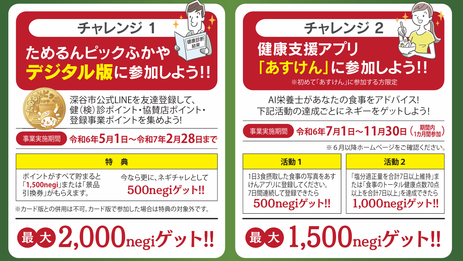 健(検)診ポイント・協賛店ポイント・登録事業ポイントを集めて、ためるんピックを達成すると、通常ためるんピックふかや達成でもらえる1,500円相当の景品(授産施設等の景品もしくは1,500negiのどちらか選択)に加えて、ネギーチャレンジ分として500negiがもらえる!