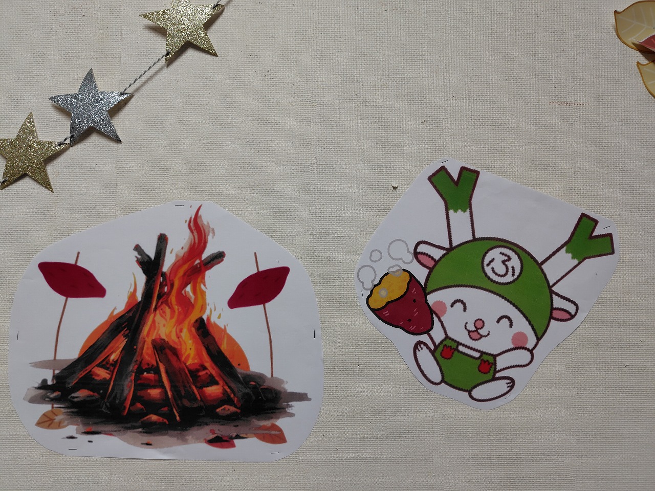 ふっかちゃんが、枯れ葉を集めてたき火です。焼き芋を焼いて美味しそうですね(^^)