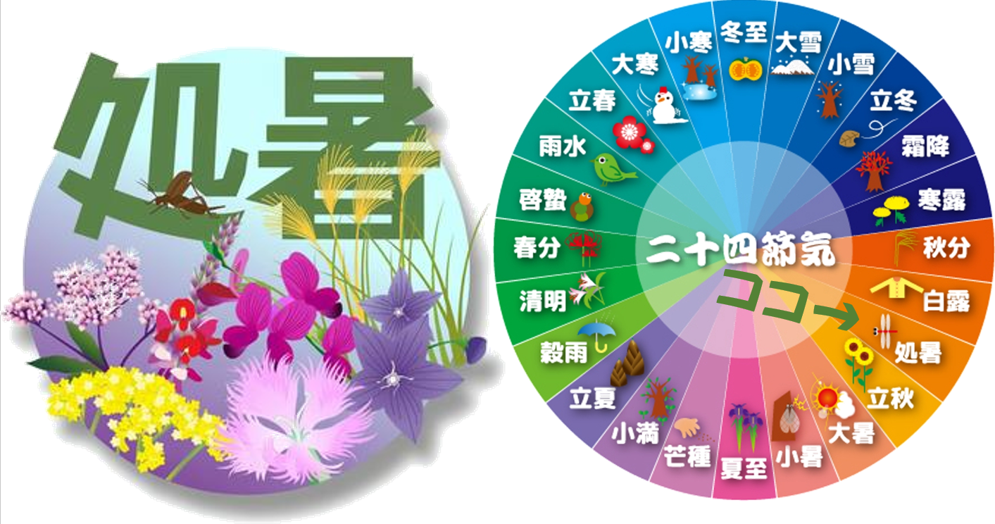 「処暑」の一つ前の節気は「立秋」(8月7日頃)、一つ後の節気は「白露」(9月8日頃)。「処暑」には期間としての意味もあり、この日から、次の節気の「白露」前日までとのこと。