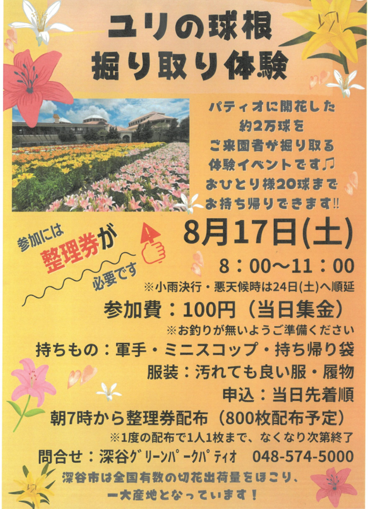 施設から車で5分程度で行けるパティオ(プールのあるところ)でユリの球根掘り取り体験ができます!