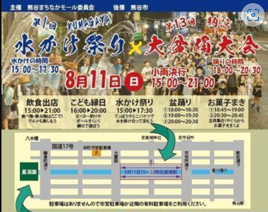 深谷のお隣熊谷で”第1回水かけ祭り&第13回納涼大盆踊り大会”が開催されるようです。