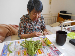 いんげんを居室で剥いてくださいました。